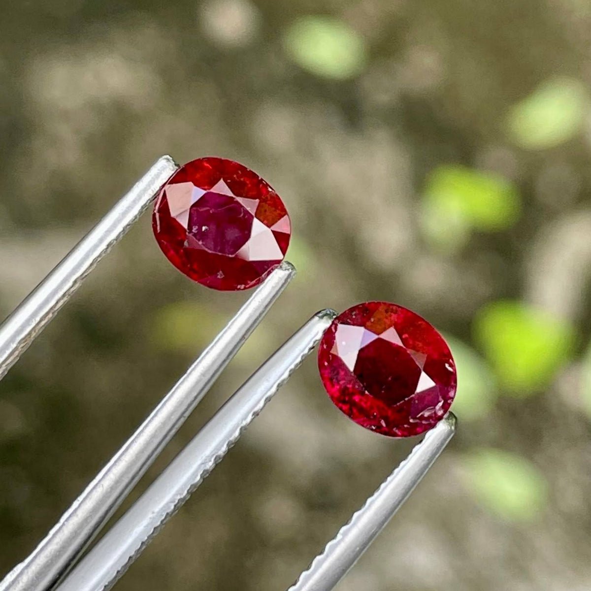 This exquisite pair of natural red ruby gemstones, sourced from Mozambique, showcases a combined weight of 2.15 carats. Each ruby is masterfully crafted in an elegant oval cut, enhancing the stones' natural brilliance and allowing light to radiate through their rich, vivid red hues. Known for their exceptional clarity and vibrant color, Mozambique rubies are highly prized, and this pair is no exception. The saturated crimson color of these rubies embodies passion and energy, making them a stunning choice for fine jewelry or a collector's gemstone. Their durability and timeless beauty ensure that these gems will be cherished for generations.