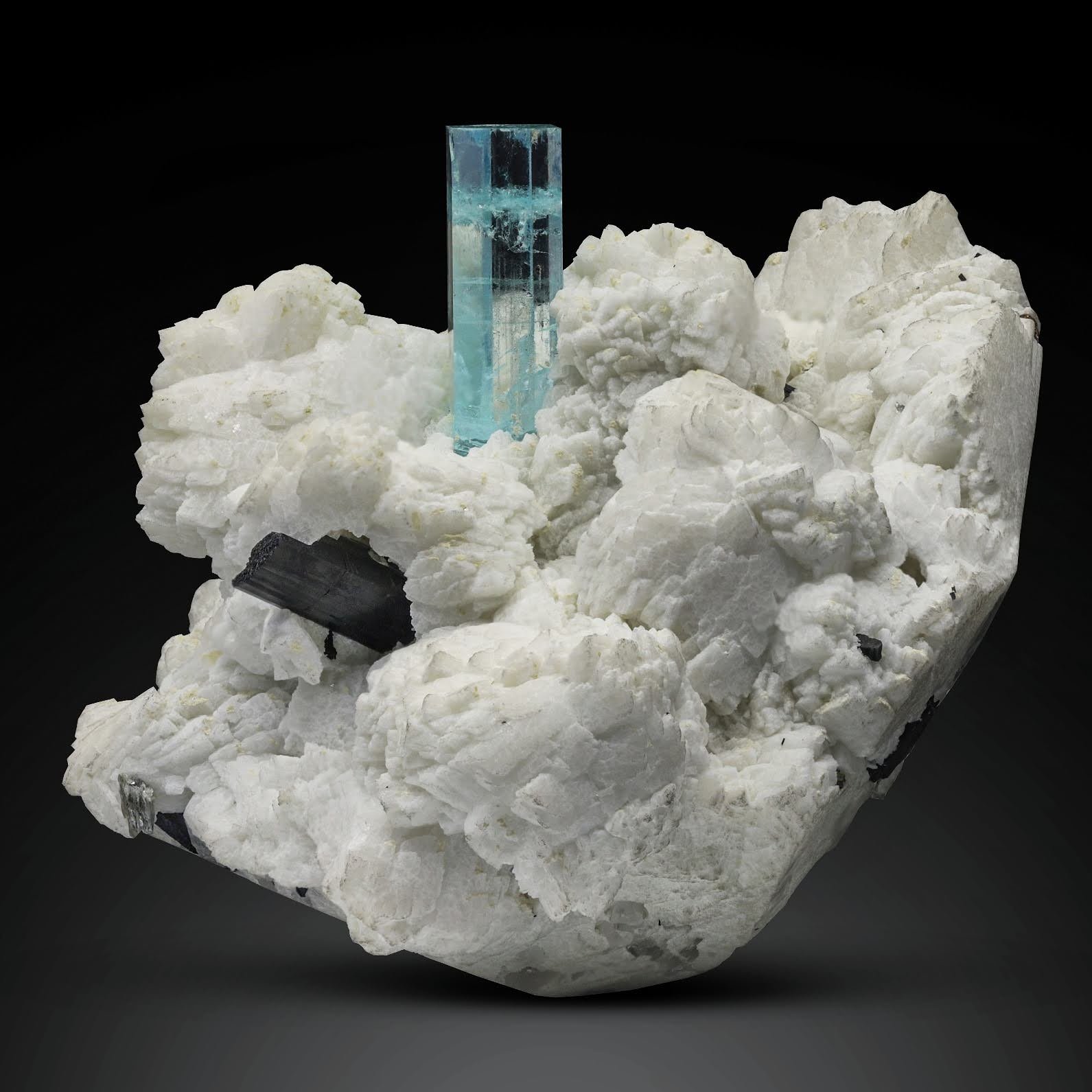 This stunning specimen from Pakistan features a breathtaking free-standing aquamarine crystal elegantly perched on a bed of pristine albite. The aquamarine, with its captivating sky-blue hue, rises majestically, showcasing its flawless transparency and perfectly terminated edges. The crystal's vibrant color contrasts beautifully with the milky white albite matrix, creating a visually striking and harmonious composition. This natural masterpiece not only highlights the exquisite beauty of aquamarine but also emphasizes the delicate interplay between the two minerals. Ideal for collectors and connoisseurs, this piece embodies the geological wonder and artistry found in nature's creations, making it a treasured addition to any mineral collection.